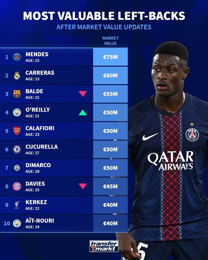 In the latest roundup by Transfermarkt, Nuno Mendes of Paris Saint-Germain has maintained his position as the most valuable left-back in world football, boasting a market value of €75 million. The 23-year-old has yet again solidified his status, with fellow top talents Alvaro Carreras and Alex Balde closely pursuing him.